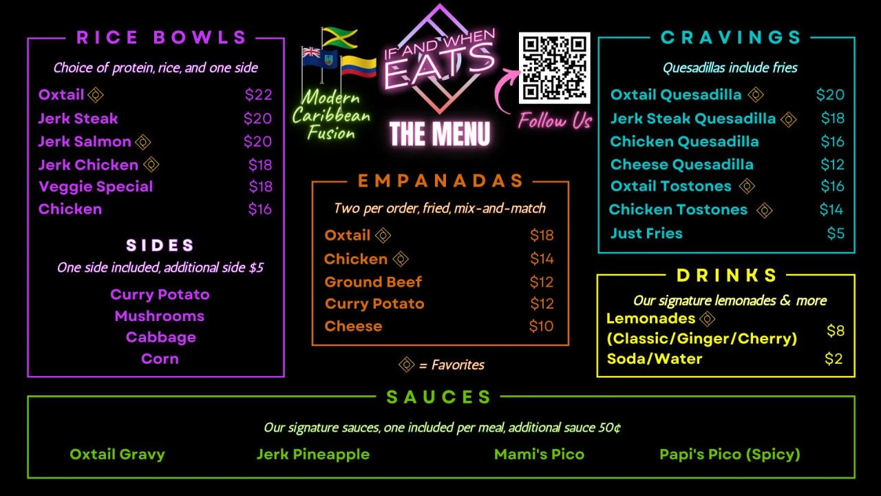 If & When Eats is a Black and Hispanic-owned food truck bringing Caribbean flavor and serious heart to the South Florida food scene. Founded in 2023, the team is rooted in Jamaican, Montserratian, and Colombian heritage — and you can taste that culture in every bite.